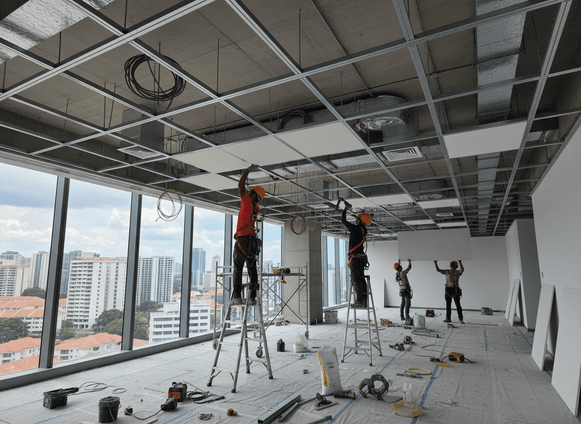 Installation of false ceilings, L-box features, pelmets, and acoustic panels.