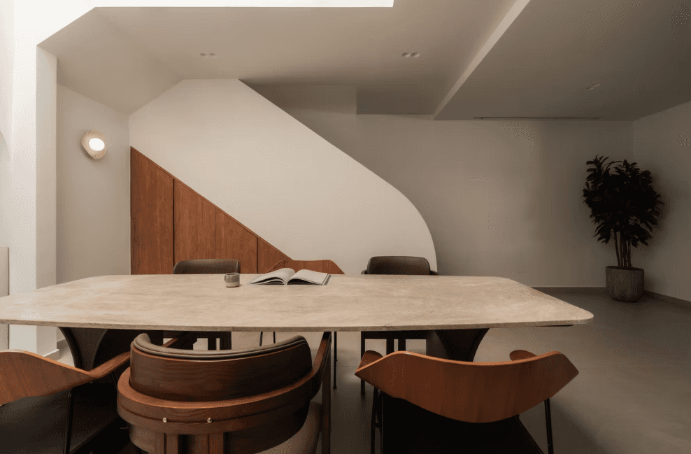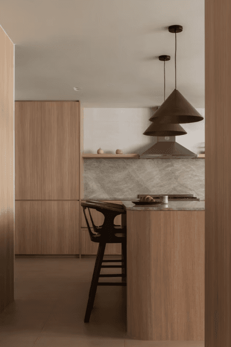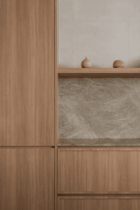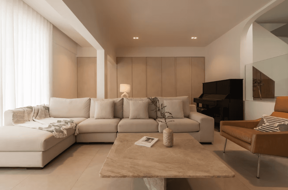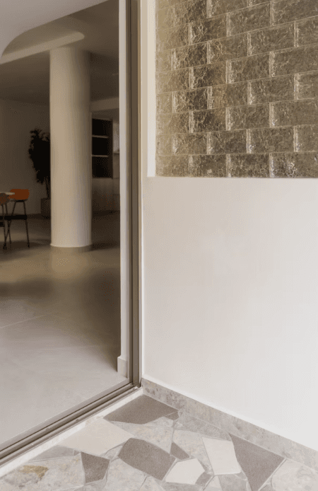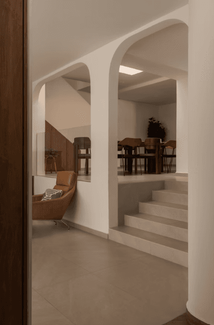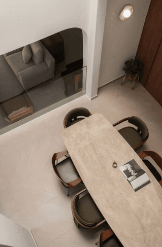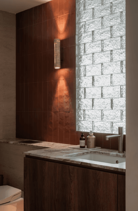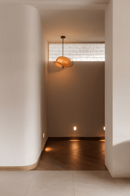 The material and colour palette were largely borrowed from the family’s happy memories of Morocco, a place filled with nature, the sea, and the sand. With a focus on the latter, the home is encased in earthy light beige and natural warm wood with pops of terracotta and the occasional use of glass blocks that serve as a formal invitation to the sun to let its light in.