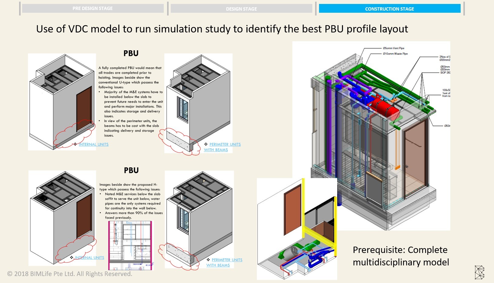 A key project focus was the use of VDC models to run simulation studies for the PBU system, allowing the team to evaluate the most suitable PBU profile layout and identify constraints before on-site execution. Through multidisciplinary coordination, the model was used to review the relationship between architectural, structural and M&E components so that practical construction issues could be resolved early.