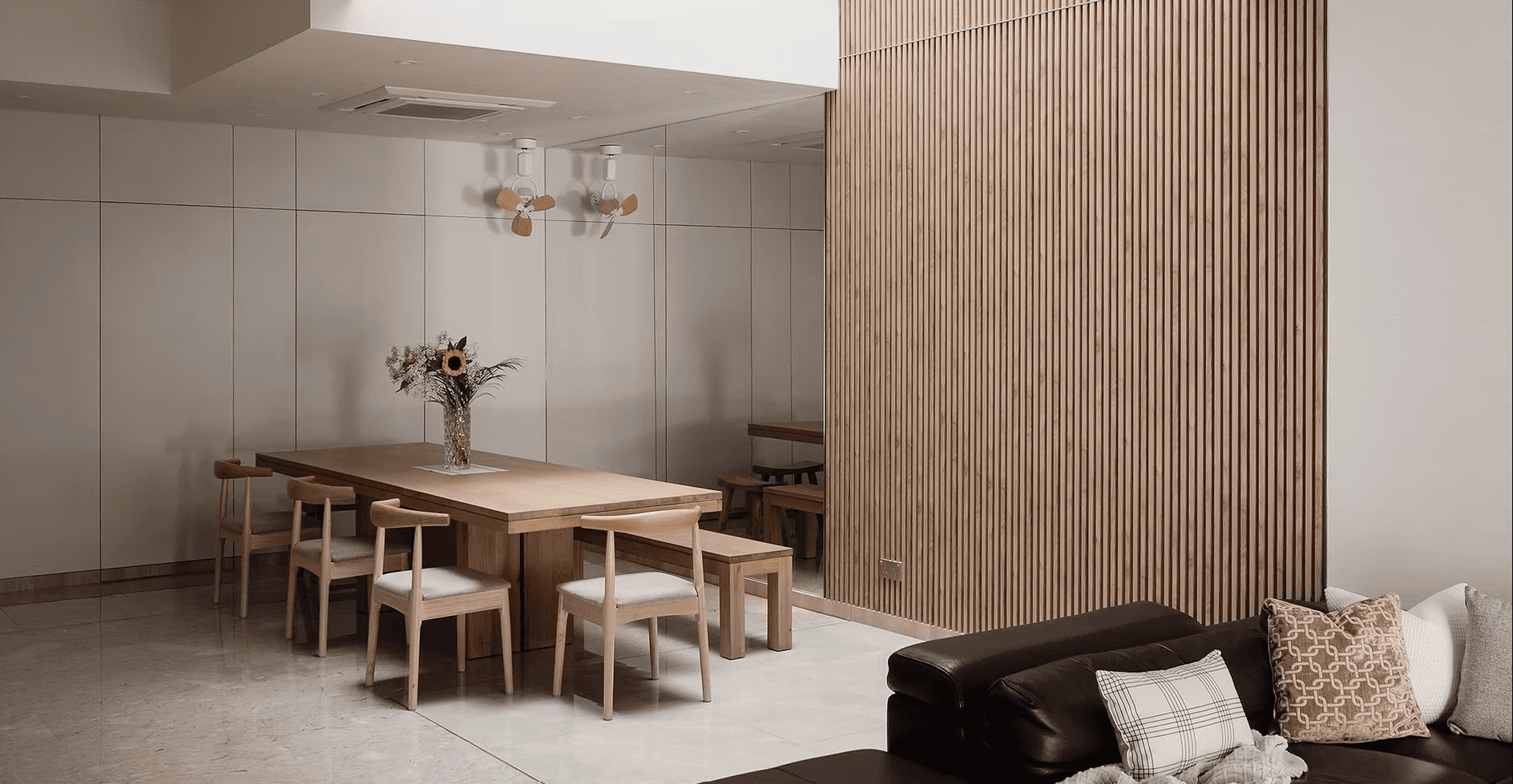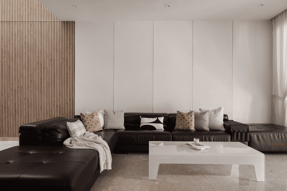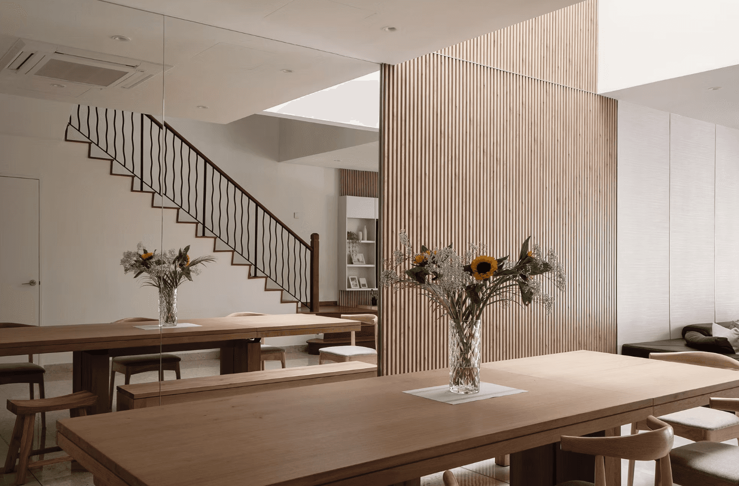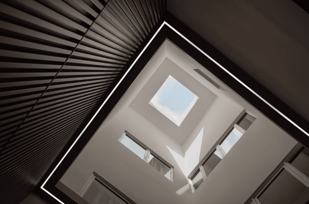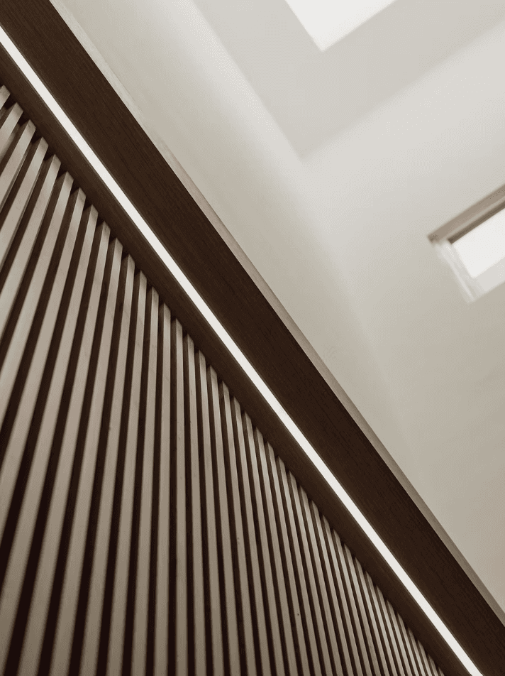 As one steps into the home, they are greeted by the natural light that permeates every floor of the home through the skylight that sits in the middle of the space. It is captivating and soothing — an effect similar to the repetitive yet comforting motions of a deep, cascading waterfall. The skylight is paired with a fluted wooden panel wall that only adds to the imagery.