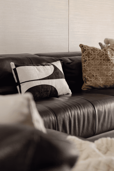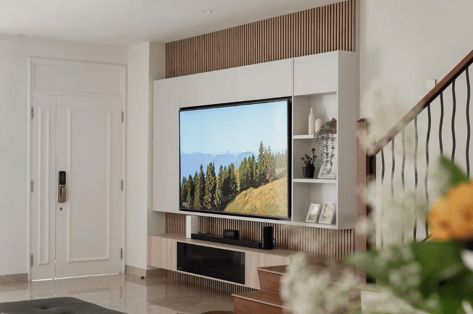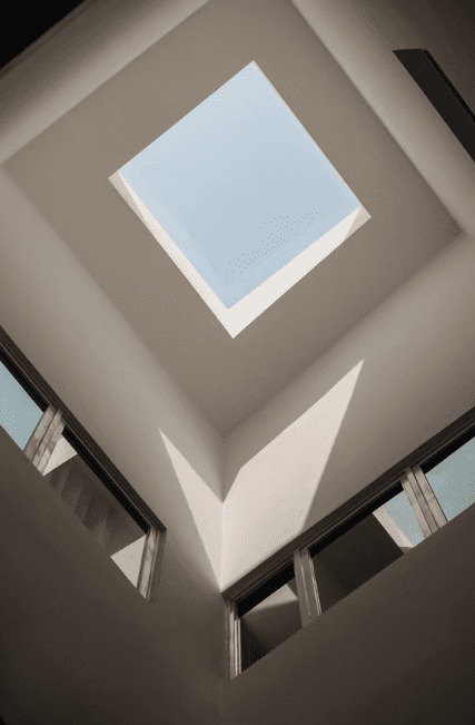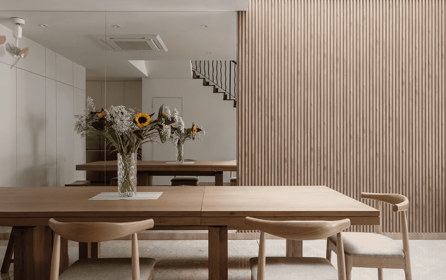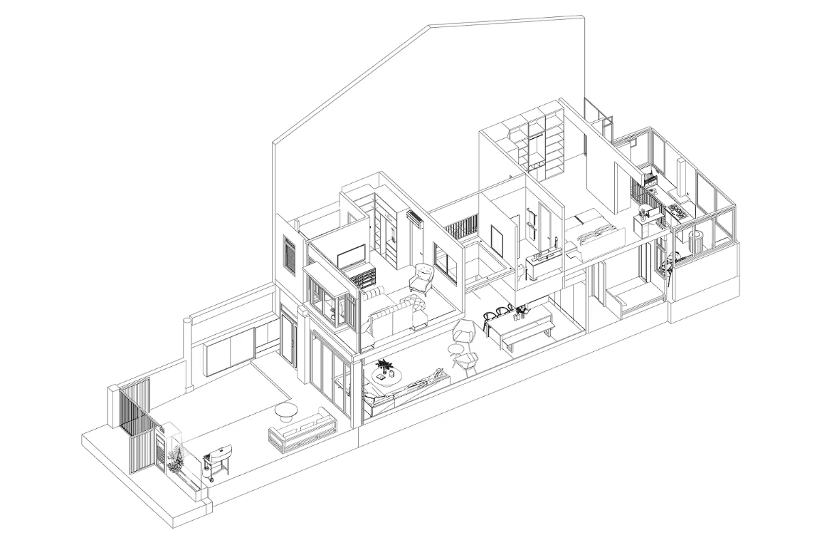 As one steps into the home, they are greeted by the natural light that permeates every floor of the home through the skylight that sits in the middle of the space. It is captivating and soothing — an effect similar to the repetitive yet comforting motions of a deep, cascading waterfall. The skylight is paired with a fluted wooden panel wall that only adds to the imagery.