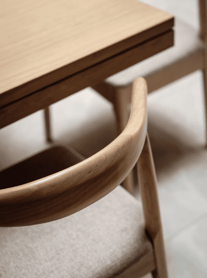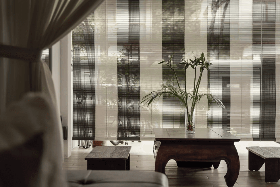 The rest of the home is furnished in neutral tones and light wood to provide comfort, warmth, and a visual reset from external stimuli. Of particular note is the antique rosewood furniture resting along the outdoor patio decorated with bamboo chick blinds, exuding a feeling of peaceful serenity.